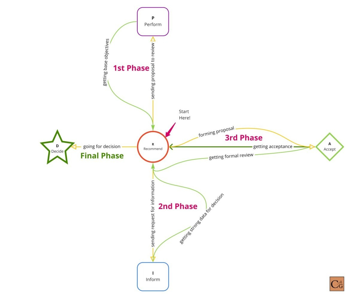 Now, we will switch to two groups related to final decision-making. First is the "A" group for "Accept" or "Approvers." This group doesn't make decisions itself, but can stop decisions. Here, we'll find compliance officers, lawyers, financial representatives, and others who regulate parts of the company connected to the project. This might also include teams like Infrastructure if, for example, you're planning on-premise software but aren't sure whether your company has the required hardware.